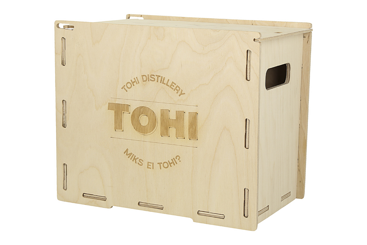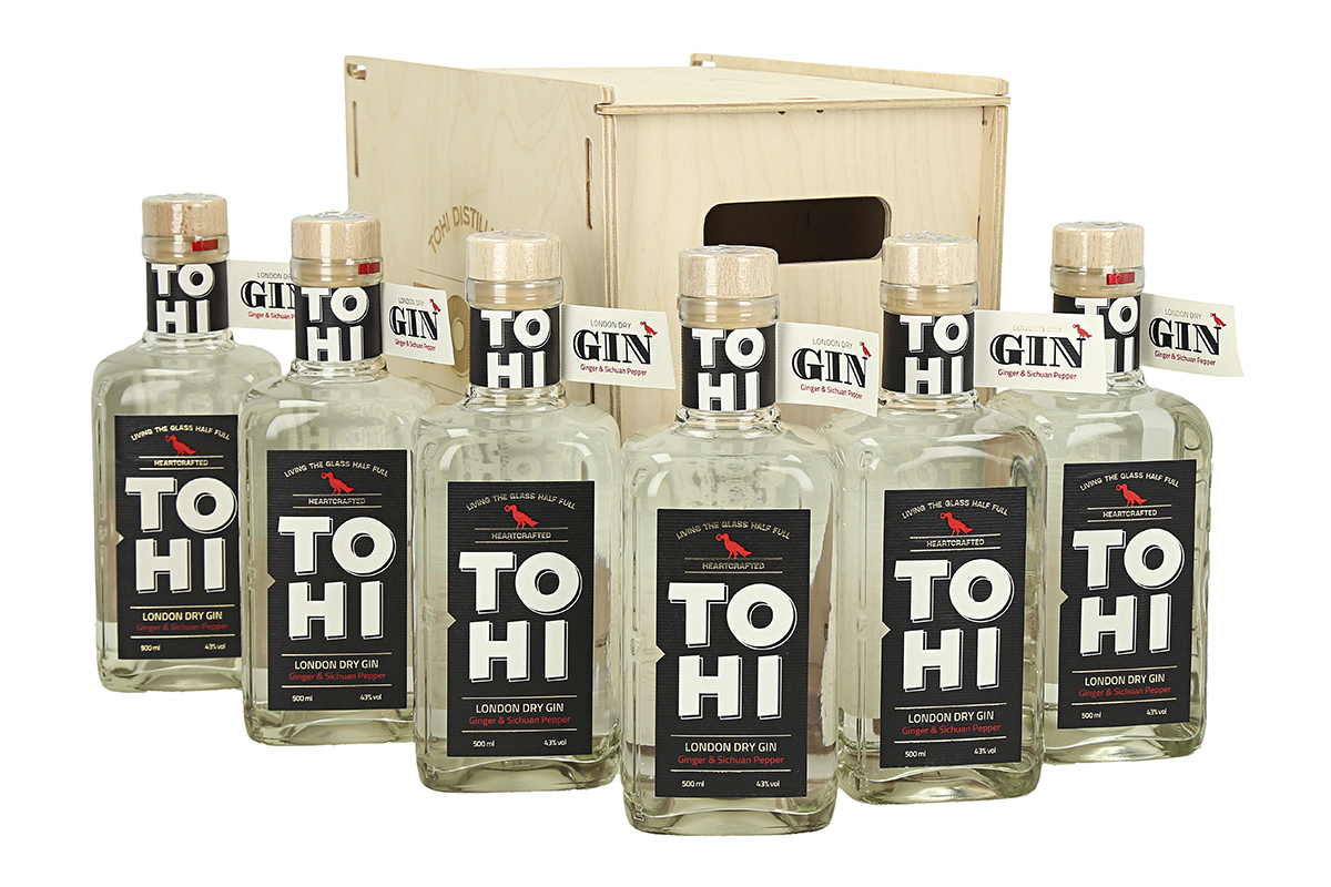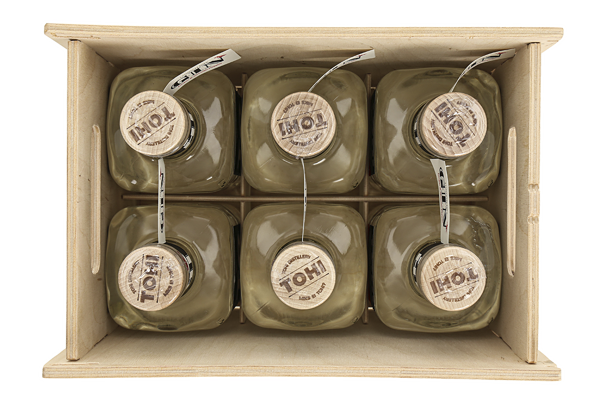 Spetsiaalne TOHI vineerkast, milles ootavad Sind kuus pudelit džinni – TOHI London Dry Gin (6 x 0,5 L 43% vol)